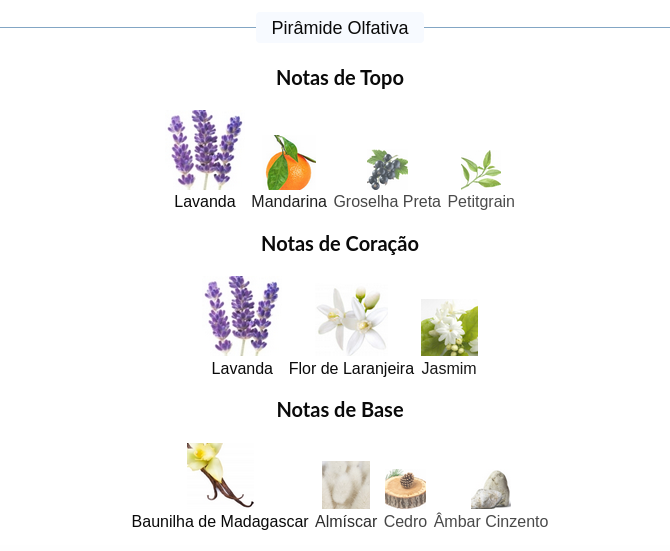 As notas de topo são: Lavanda, Mandarina, Groselha Preta e Petitgrain.