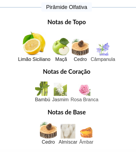 As notas de topo são: Limão Siciliano, Maçã, Cedro e Câmpanula.