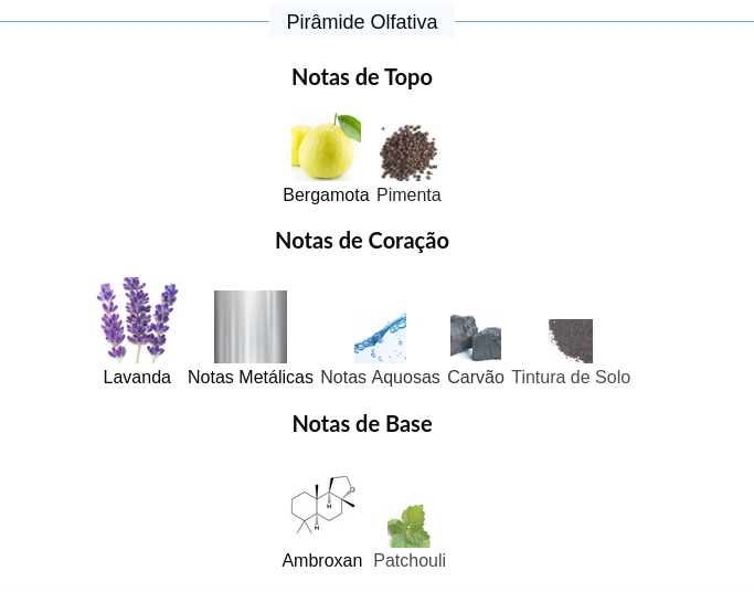 As notas de coração são: Lavanda, Notas Metálicas, Notas Aquosas, Carvão e Tintura de Solo.