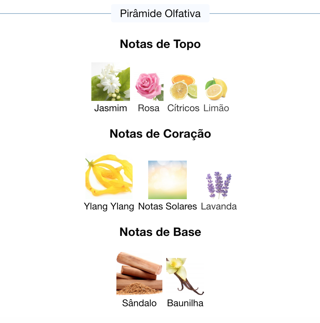 As notas de coração são: Ylang Ylang, Notas Solares e Lavanda.