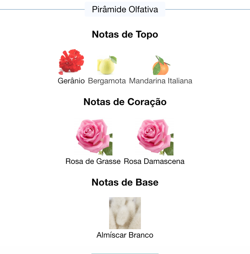 As notas de coração são: Rosa de Grasse e Rosa Damascena.