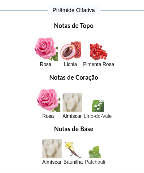 As notas de topo são: Rosa, Lichia e Pimenta Rosa.