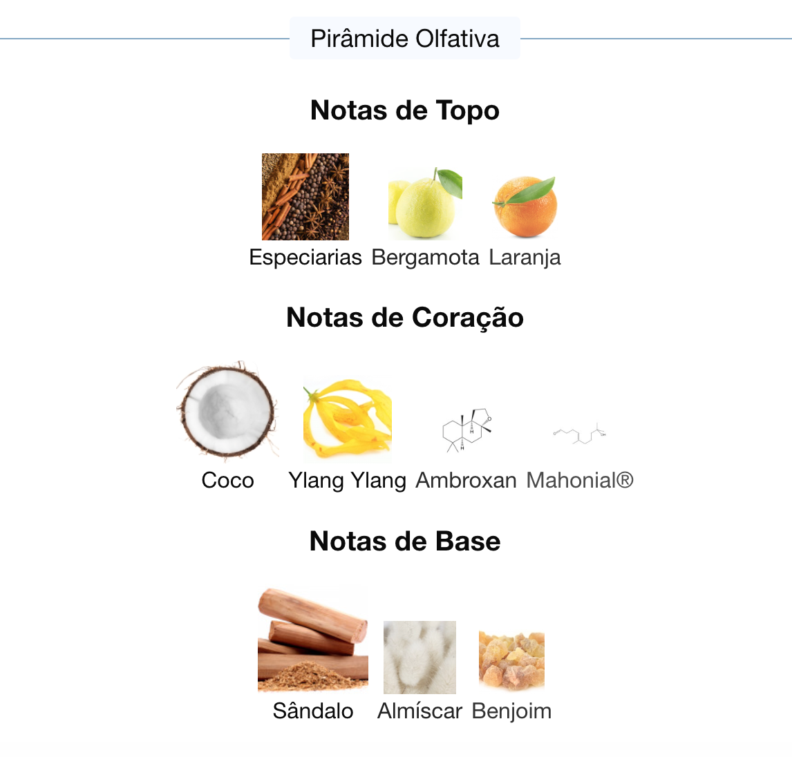 Notas de coração: Coco, Ylang Ylang, Ambroxan, Mahonial