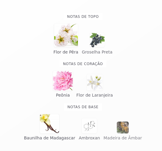 As notas de fundo são: Baunilha de Madagascar, Ambroxan e Madeira de Âmbar.