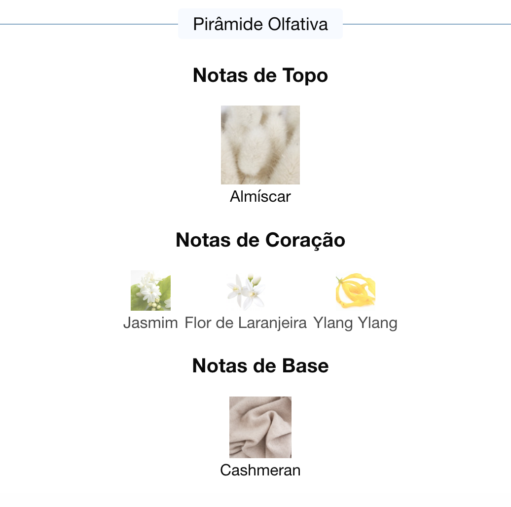 As notas de coração são: Jasmim, Flor de Laranjeira e Ylang Ylang.