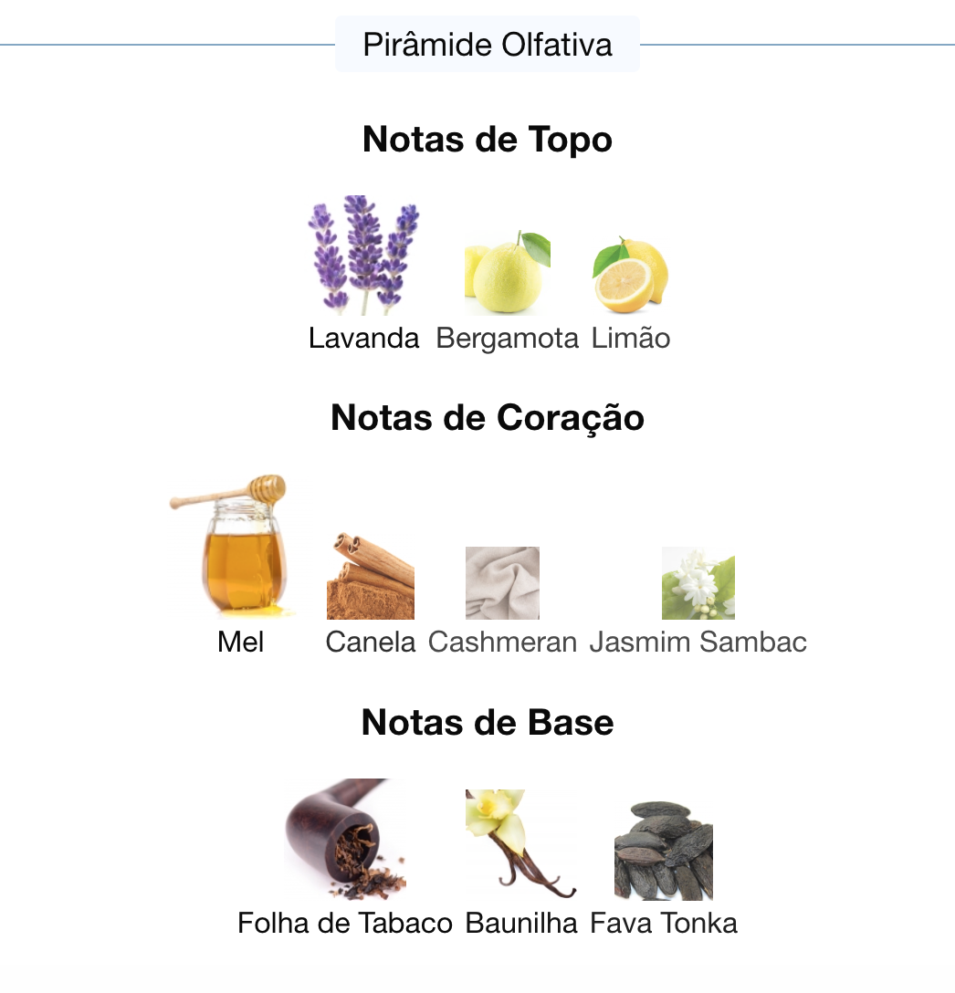 As notas de fundo são: Folha de Tabaco, Baunilha e Fava Tonka.
