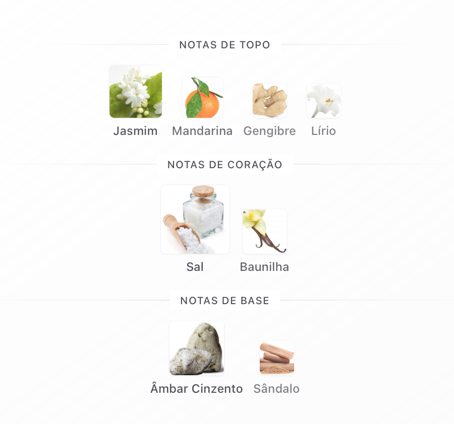 As notas de topo são: Jasmim, Mandarina, Gengibre e Lírio.