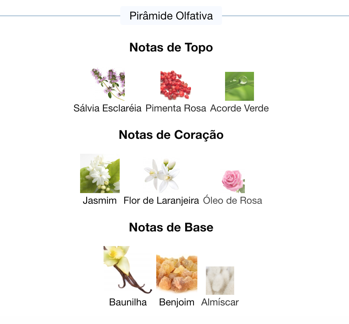 As notas de fundo são: Baunilha, Benjoim e Almíscar.