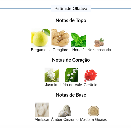 As notas de topo são: Bergamota, Gengibre, Hortelã e Noz-moscada.