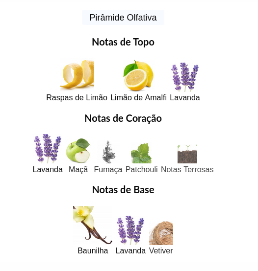 As notas de fundo são: Baunilha, Lavanda e Vetiver.