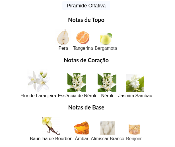 As notas de fundo são: Baunilha de Bourbon, Âmbar, Almíscar Branco e Benjoim.