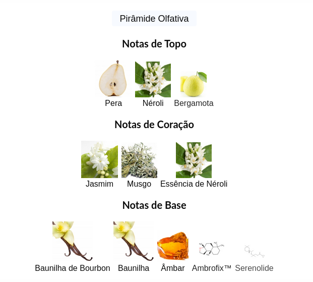 As notas de topo são: Pera, Néroli e Bergamota.