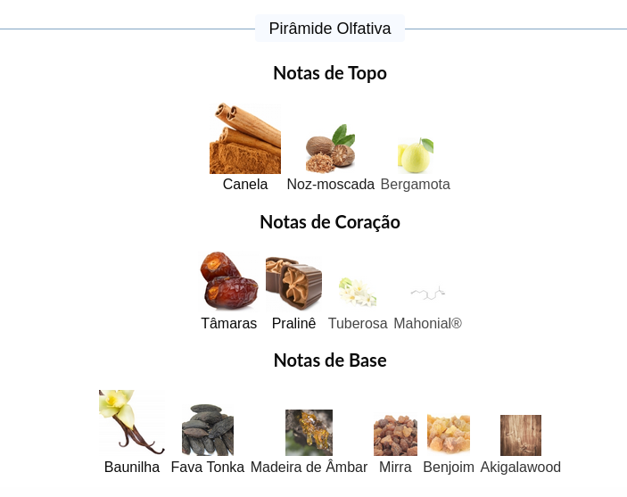 As notas de fundo são: Baunilha, Fava Tonka, Madeira de Âmbar, Mirra, Benjoim e Akigalawood.