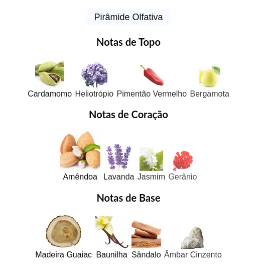 As notas de topo são: Heliotrópio, Cardamomo, Pimentão Vermelho e Bergamota.