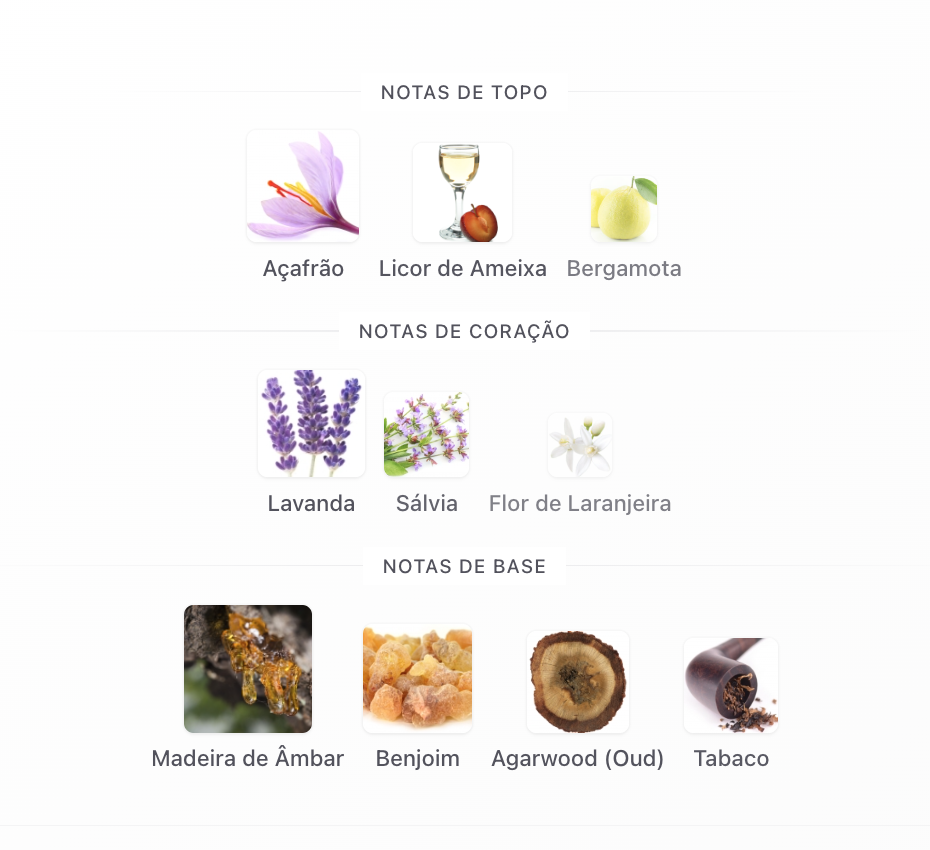 As notas de fundo são: Madeira de Âmbar, Benjoim, Agarwood (Oud) e Tabaco.