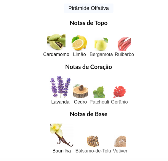 As notas de topo são: Cardamomo, Limão, Bergamota e Ruibarbo.