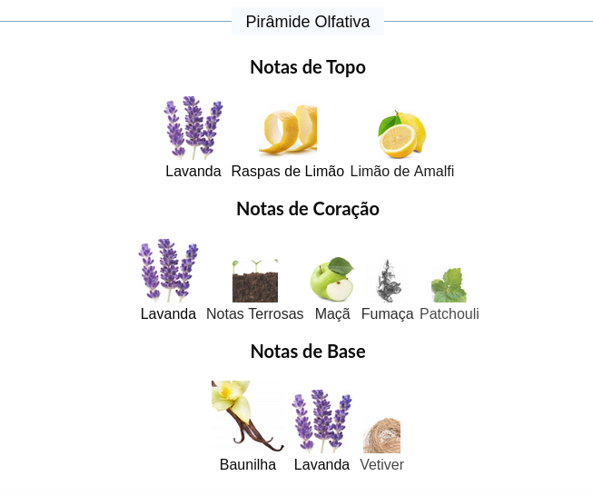 As notas de topo são: Lavanda, Raspas de Limão e Limão de Amalfi.