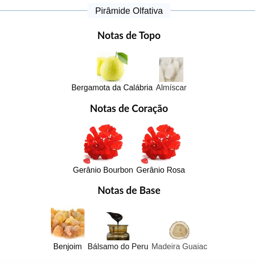 As notas de coração são: Gerânio Bourbon e Gerânio Rosa.