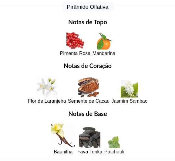 As notas de fundo são: Baunilha, Fava Tonka e Patchouli.