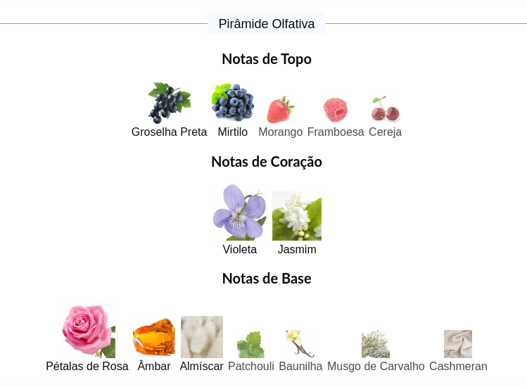 As notas de topo são: Groselha Preta, Mirtilo, Morango, Framboesa e Cereja.