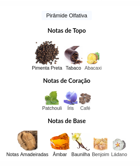 As notas de fundo são: Notas Amadeiradas, Âmbar, Baunilha, Benjoim e Ládano.