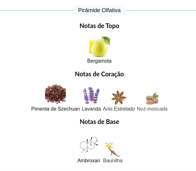 As notas de coração são: Pimenta de Szechuan, Lavanda, Anis Estrelado e Noz-moscada.
