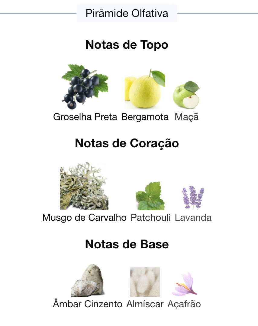 As notas de topo são: Groselha Preta, Bergamota e Maçã.