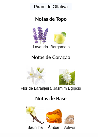 As notas de fundo são: Baunilha, Âmbar e Vetiver.