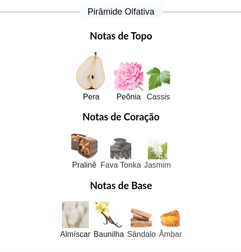 As notas de coração são: Pralinê, Fava Tonka e Jasmim.