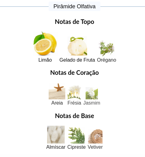 As notas de topo são: Limão, Gelado de Fruta e Orégano.