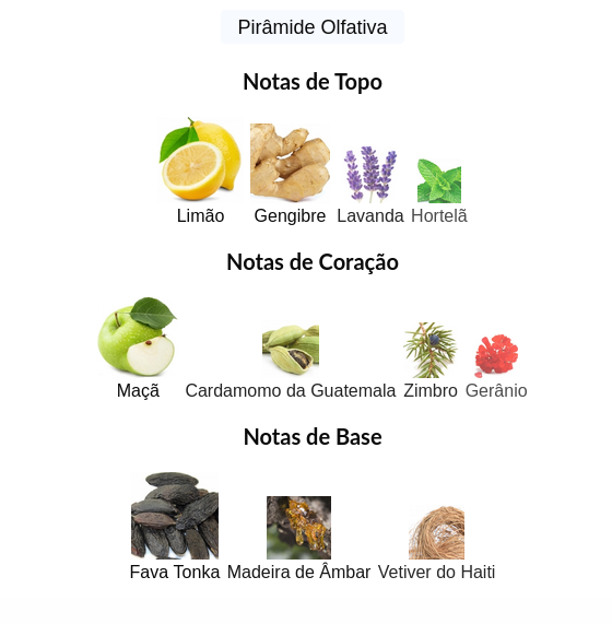 As notas de topo são: Limão, Gengibre, Lavanda e Hortelã.