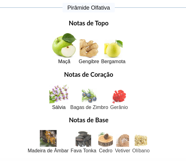 As notas de fundo são: Madeira de Âmbar, Fava Tonka, Cedro, Vetiver e Olíbano.